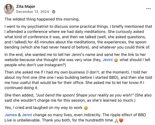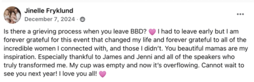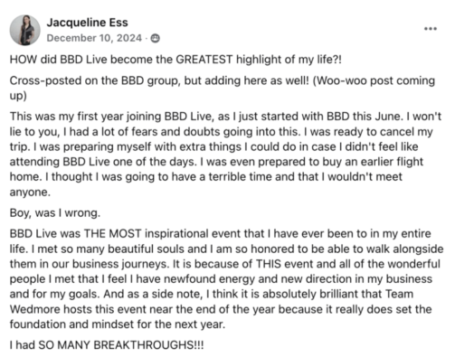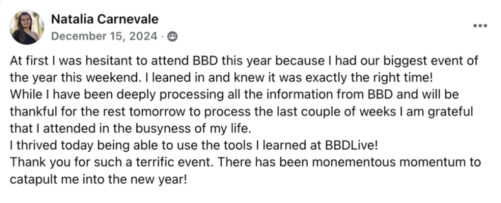 This event has been absolutely transformational for our members, whether they’re just starting out or they’re veterans (there’s a reason some of our members have been to all FOURTEEN BBD LIVES!). And they’re going to be extraordinary for you.